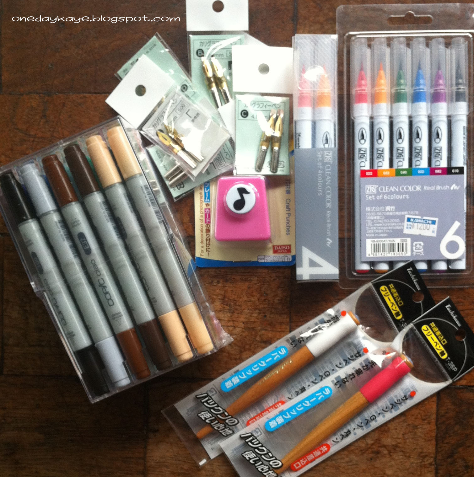 This weekend has been gloomy on many fronts, so I welcomed some new distractions. Mom was in Osaka for a few days, and I asked her to visit some of the craft stores mentioned on I Try DIY’s guide. I was so relieved that she was able to fly back in this morning, unaffected by Typhoon Lando’s havoc; and it was like waking up on Christmas day, with her hoarded goods laid out on a table. She brought home Royce’ (not enough!) the strange but delicious square persimmons that I love, a designer bag for herself, and a mountain of cosmetics. She also bought some USB-powered reading lamps, and she was so cute when she happily showed them to me. She scored these calligraphy holsters and nibs, Copic pens, and Kuretake brush pens for much cheaper, that I almost couldn’t believe the conversion!