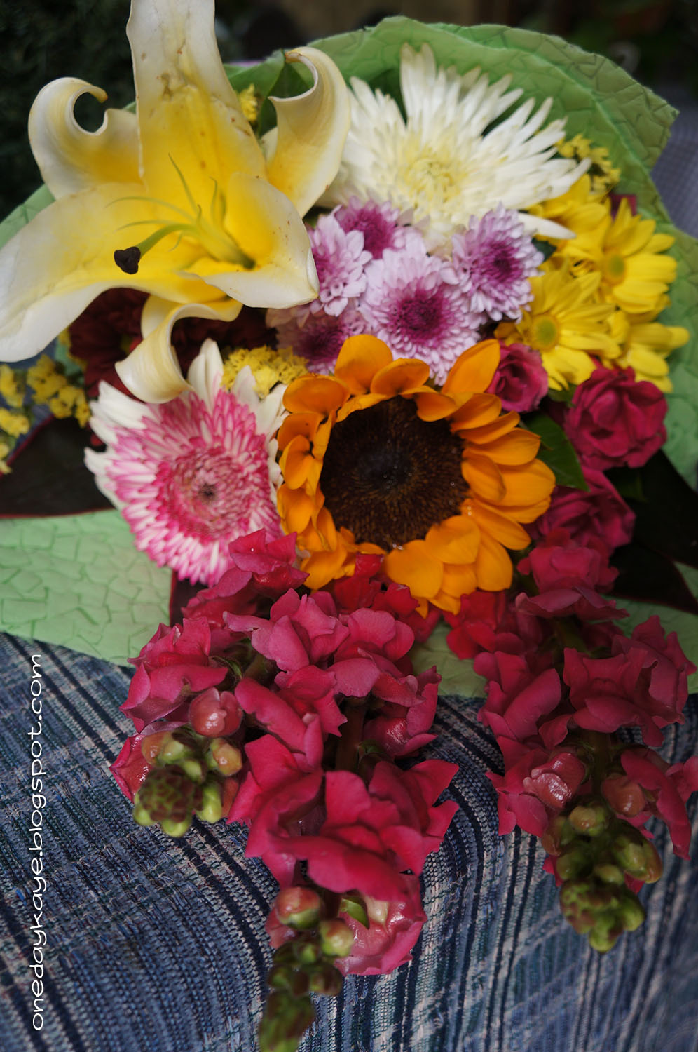 | Beautiful bouquet wrapped in pink and green (can anyone tell me what those long, pink flowers are?) |