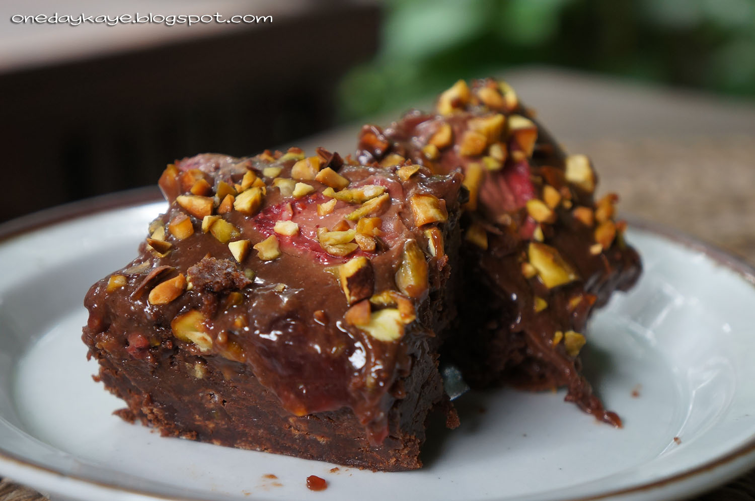 | Chocolate Brownies with Choco-Strawberry Cream Cheese Ganache. Recipe from Taste of Home. I love this because it has some of his favorites: coffee, strawberry; and some of mine: chocolate, pistachios. |